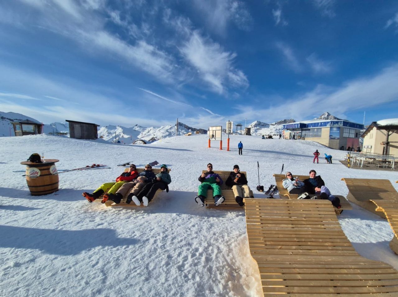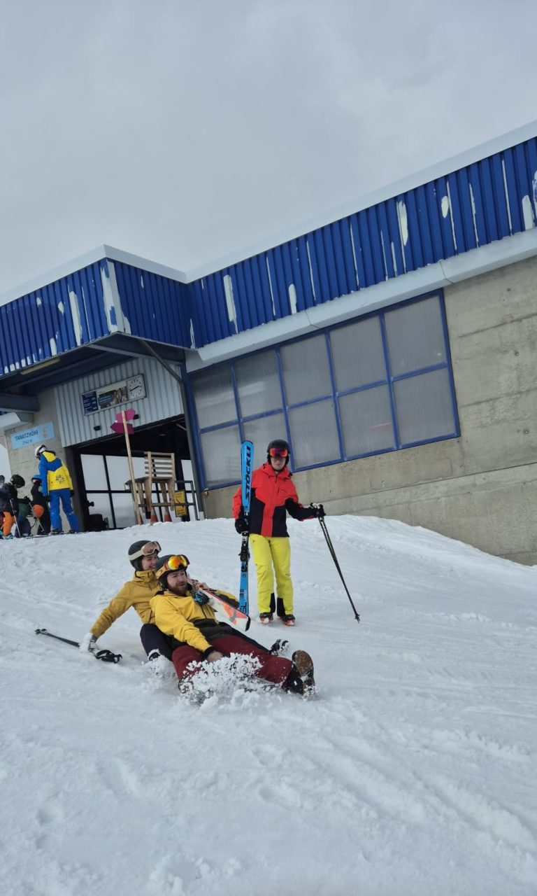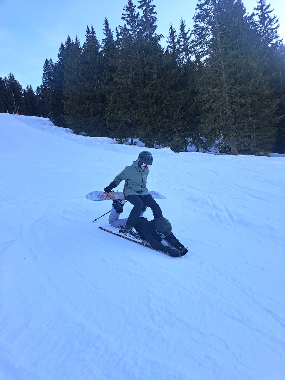 Nachdem das Gepäck ausgeladen war, ging es direkt auf die Piste – praktischerweise gleich vor unserer Haustür. Das überschaubare Pistenangebot hatte einen klaren Vorteil: Niemand konnte verloren gehen. Bei strahlendem Wetter genossen wir die Abfahrten, und einige Waghalsige wagten sich sogar an Schanzensprünge. Einzelne wurden dabei von einer mysteriösen Snowboardfahrerin verfolgt, die am Ende sogar noch ein Selfie machen wollte.