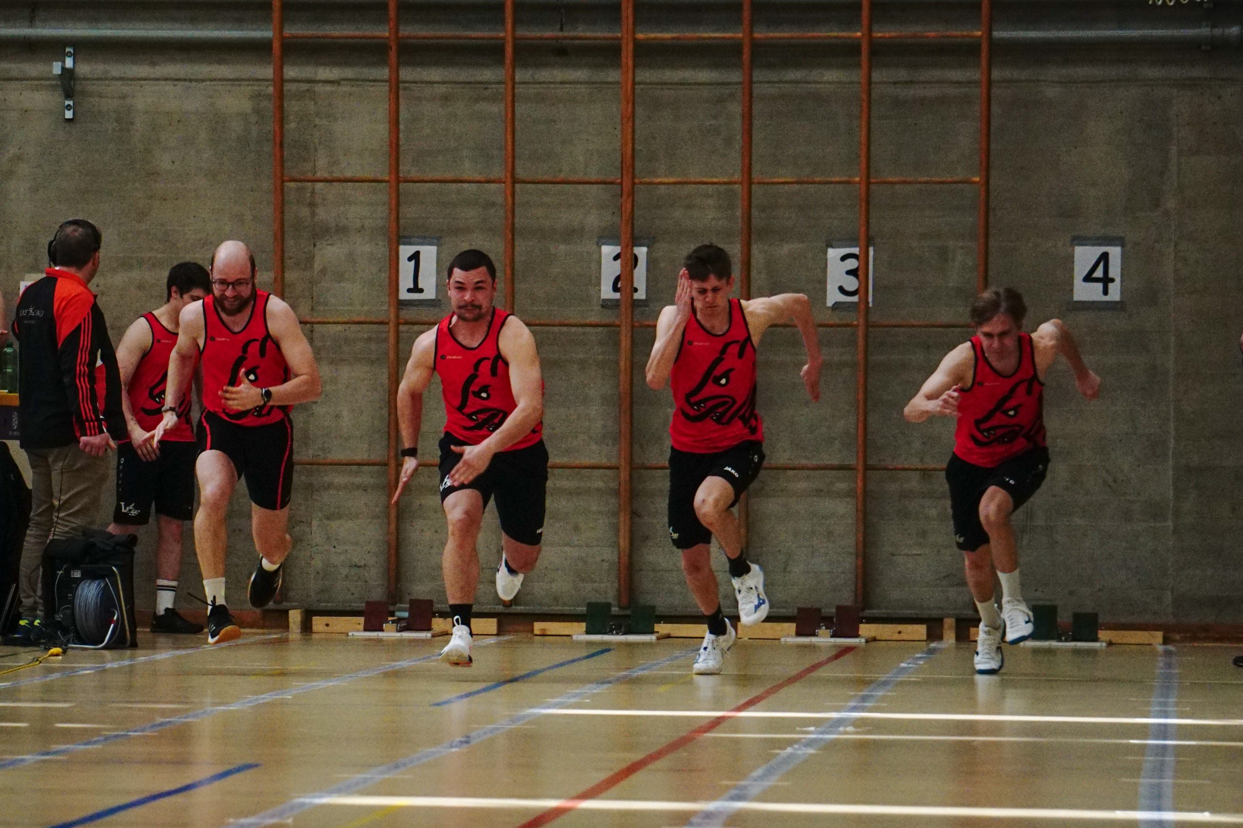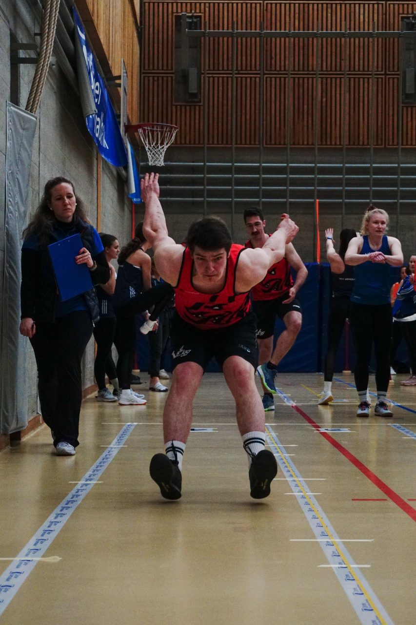 Im Hochsprung zeigte sich eine erfreuliche Gesamtleistung. Besonders hervorgetan hat sich Leonie, die an ihrem ersten Wettkampf bei den aktiven Turnerinnen starke 1.30 Meter übersprang. Weiter ging es mit dem 30 Meter Lauf der Männer. Dort zeigten sie eine solide Leistung. Liam glänzte als Bob-Anschieber besonders und sprintete in 4.21 Sekunden ins Ziel. Er war damit aber noch nicht ganz zufrieden. Der Durchschnitt der Gruppe von 4.66 Sekunden reichte dennoch für den dreizehnten Rang und damit zur ersten Auszeichnung des Tages für den Turnverein, worüber alle sehr erfreut waren.