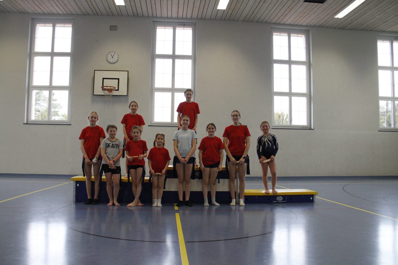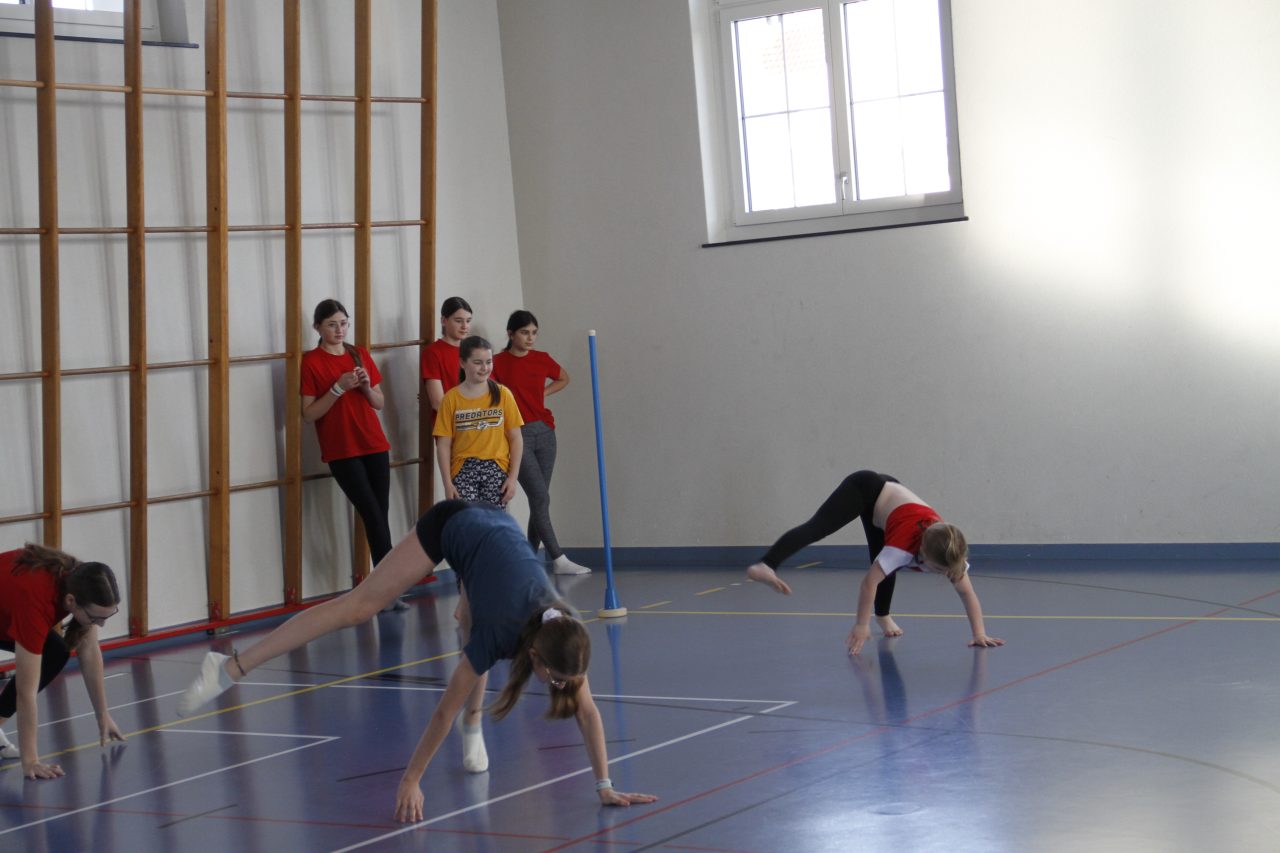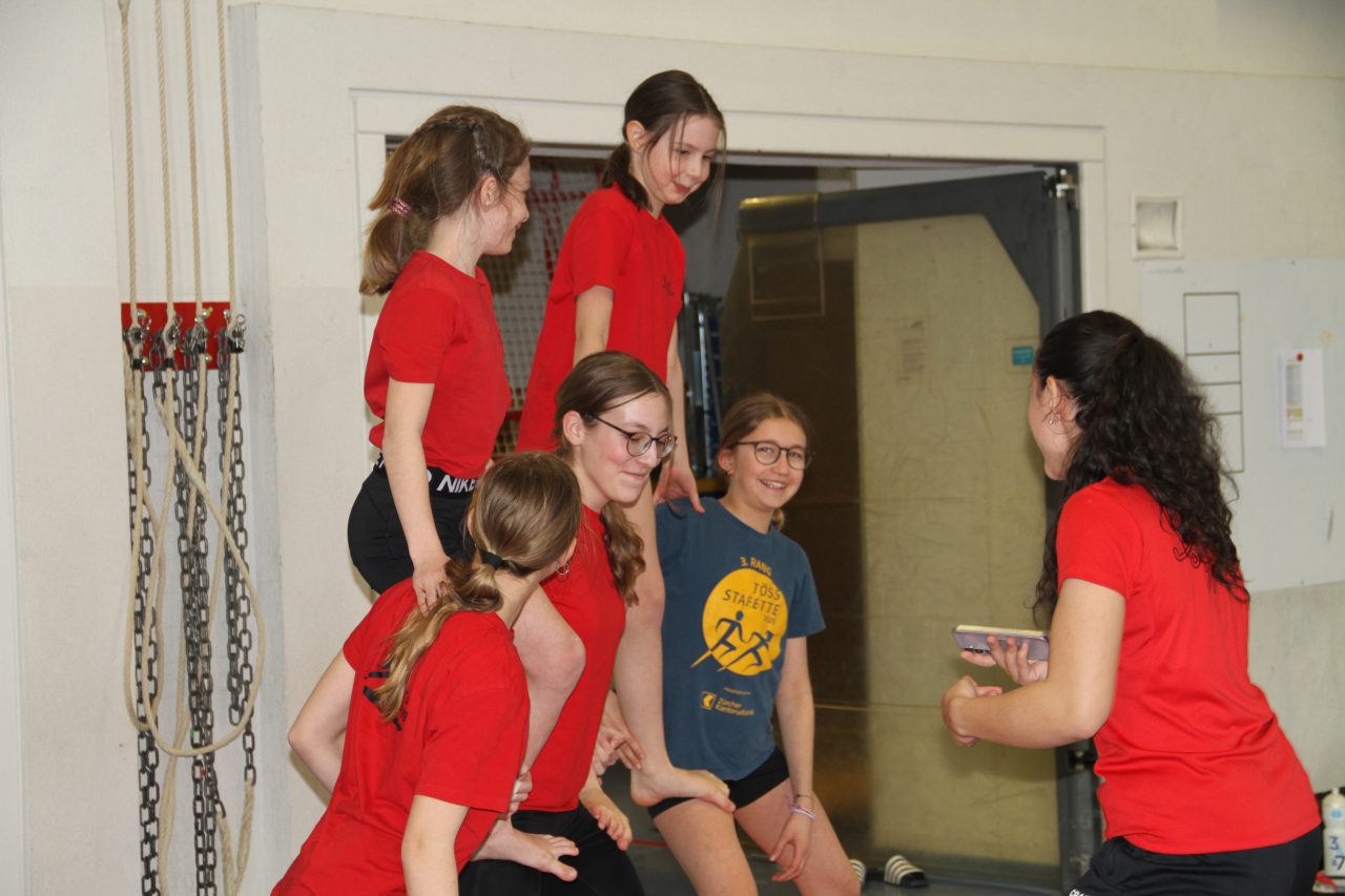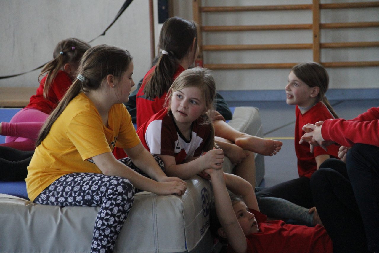 Nachdem alle Geräte wieder versorgt waren, stand zum Abschluss noch ein kreativer Teil auf dem Programm: Akrobatik! In drei altersdurchmischten Gruppen erhielten die Mädchen eine Stunde Zeit, um zu einem selbst gewählten Lied eine Choreografie einzustudieren.