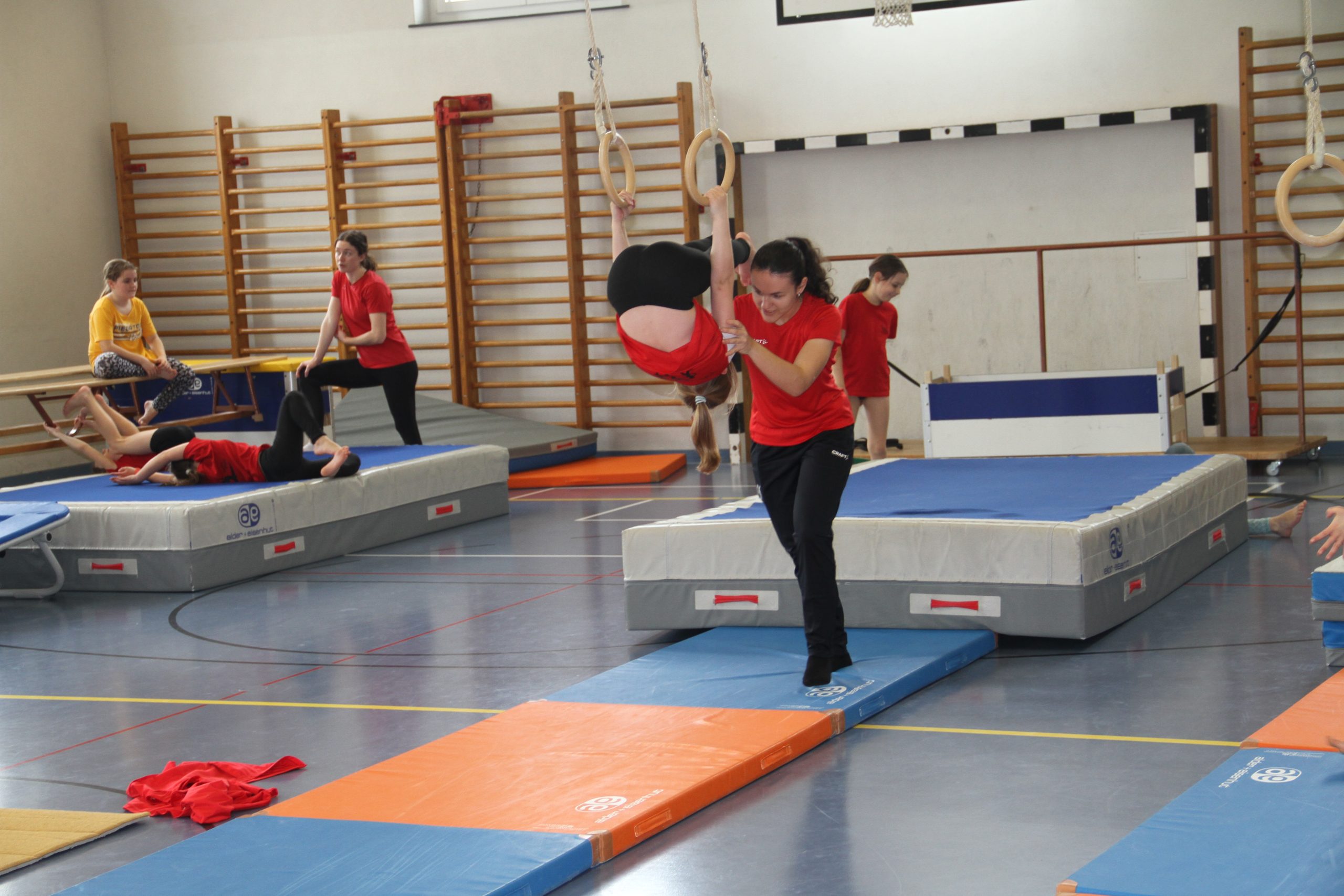 Anschliessend wurden schnell die Geräte Boden, Reck, Sprung und Schaukelringe aufgebaut und die Mädchen starteten motiviert in ihren ersten Trainingsblock. Der Morgen wurde intensiv genutzt: neue Elemente ausprobieren, Wettkampfübungen fertigstellen und hier und da noch etwas Feinschliff betreiben. Es wurde konzentriert gearbeitet, angefeuert, verbessert und natürlich auch gelacht.